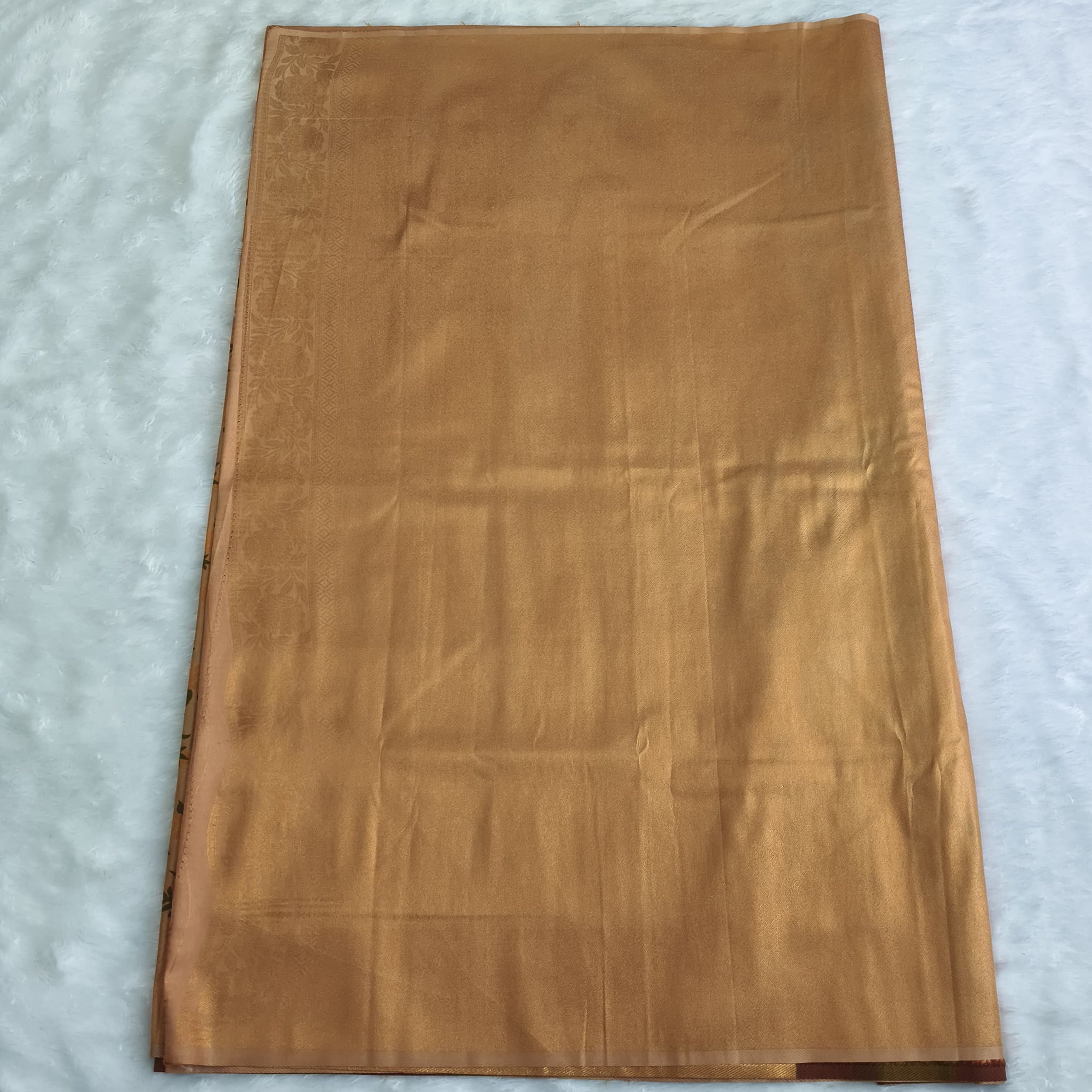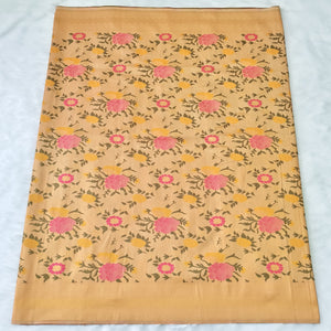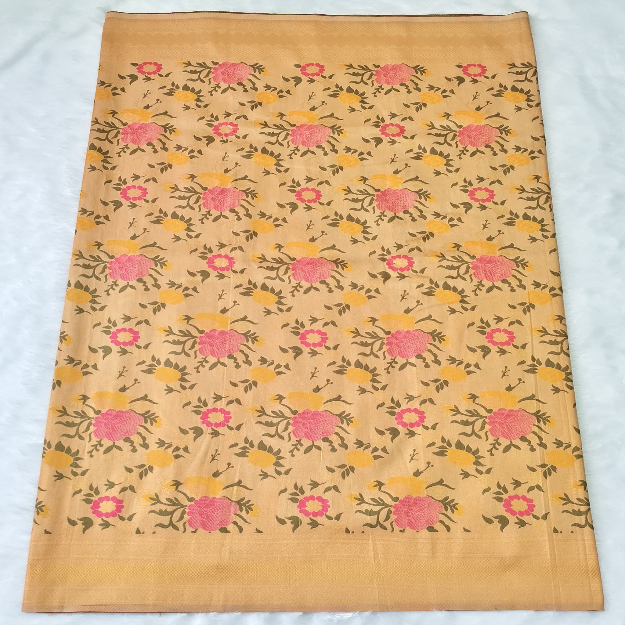 Copper zari border on whole saree, copper weaving on whole saree, floral pattern pink and yellow color, rich pallu.