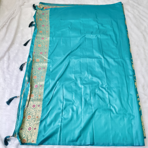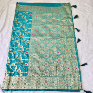 Made from shiny banarasi silk, this saree exudes elegance and opulence. Adorned with intricate designs, this saree is perfect for special occasions. Embrace traditional Indian heritage and grace with this stunning saree.