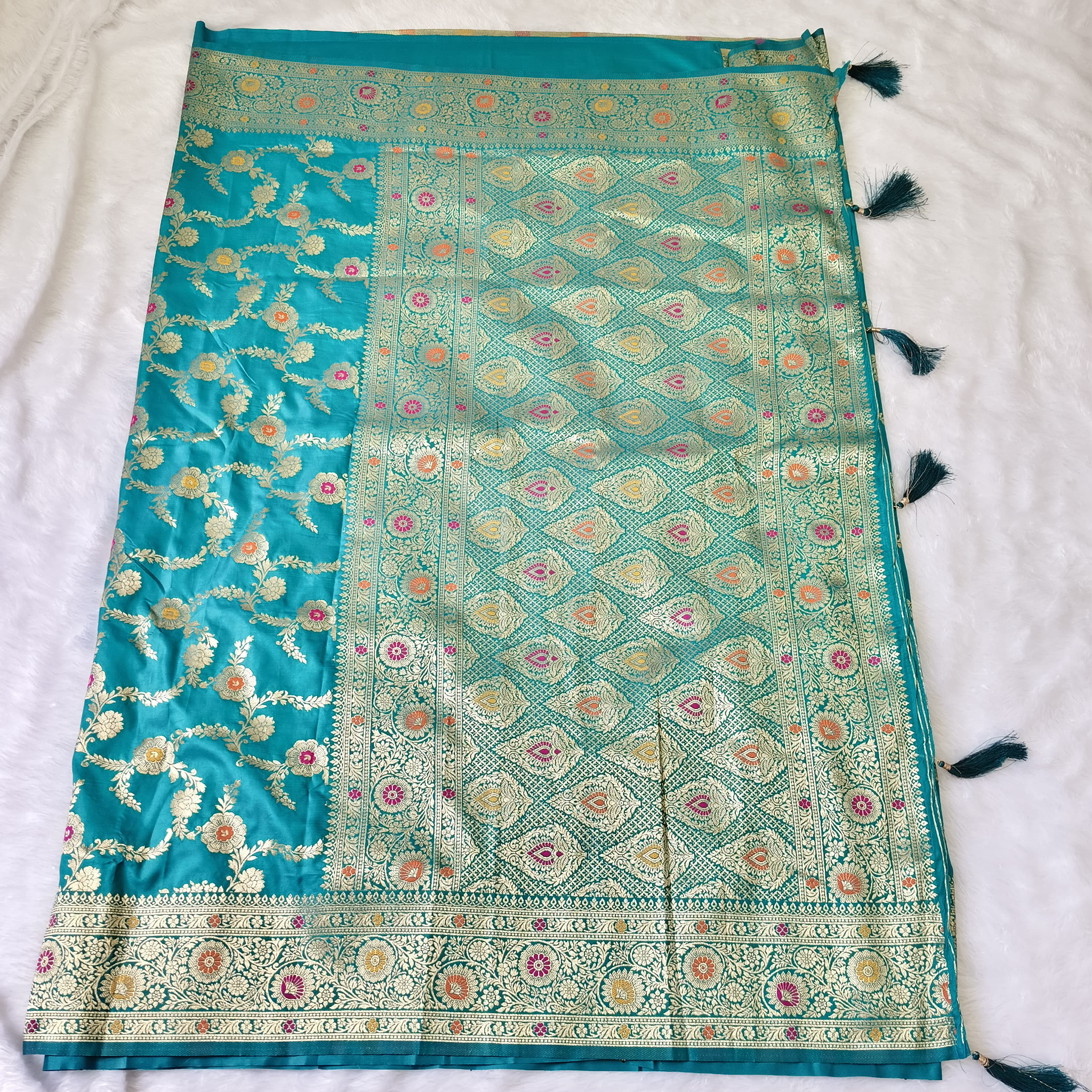 Golden zari work, big border, floral design on whole saree, rich pallu.