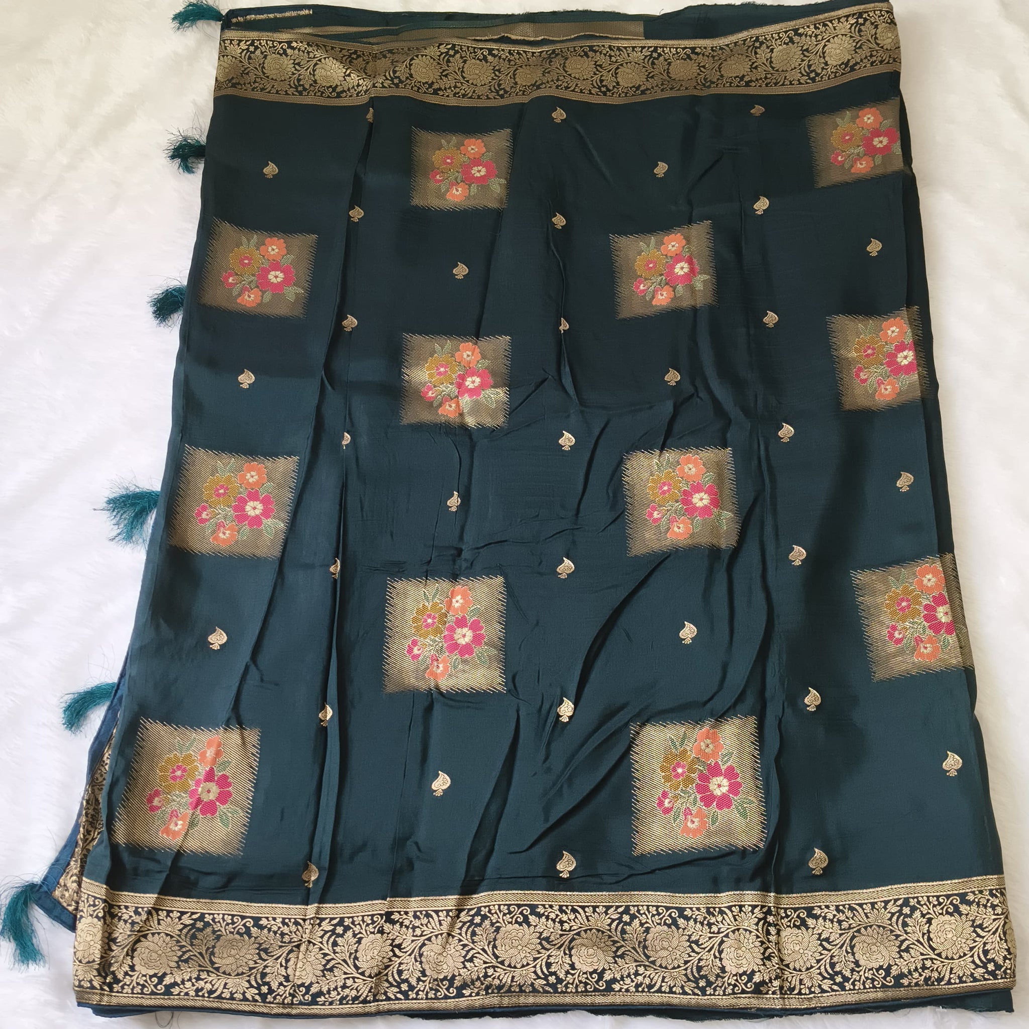 It has golden meenakari work on whole border, small buttas and floral designs on whole saree and rich pallu.