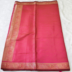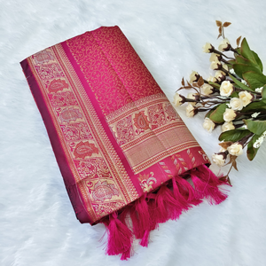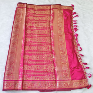 This authentic Dharmavaram silk saree features the region's signature heavy gold zari borders and pallu with intricate geometric patterns. Handwoven by skilled artisans using traditional techniques, it displays remarkable tensile strength and lustrous finish characteristic of genuine Dharmavaram craftsmanship. The contrasting color combinations and temple motifs represent centuries-old weaving heritage from Andhra Pradesh.