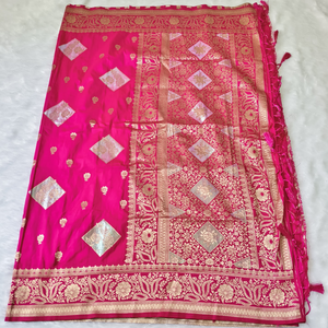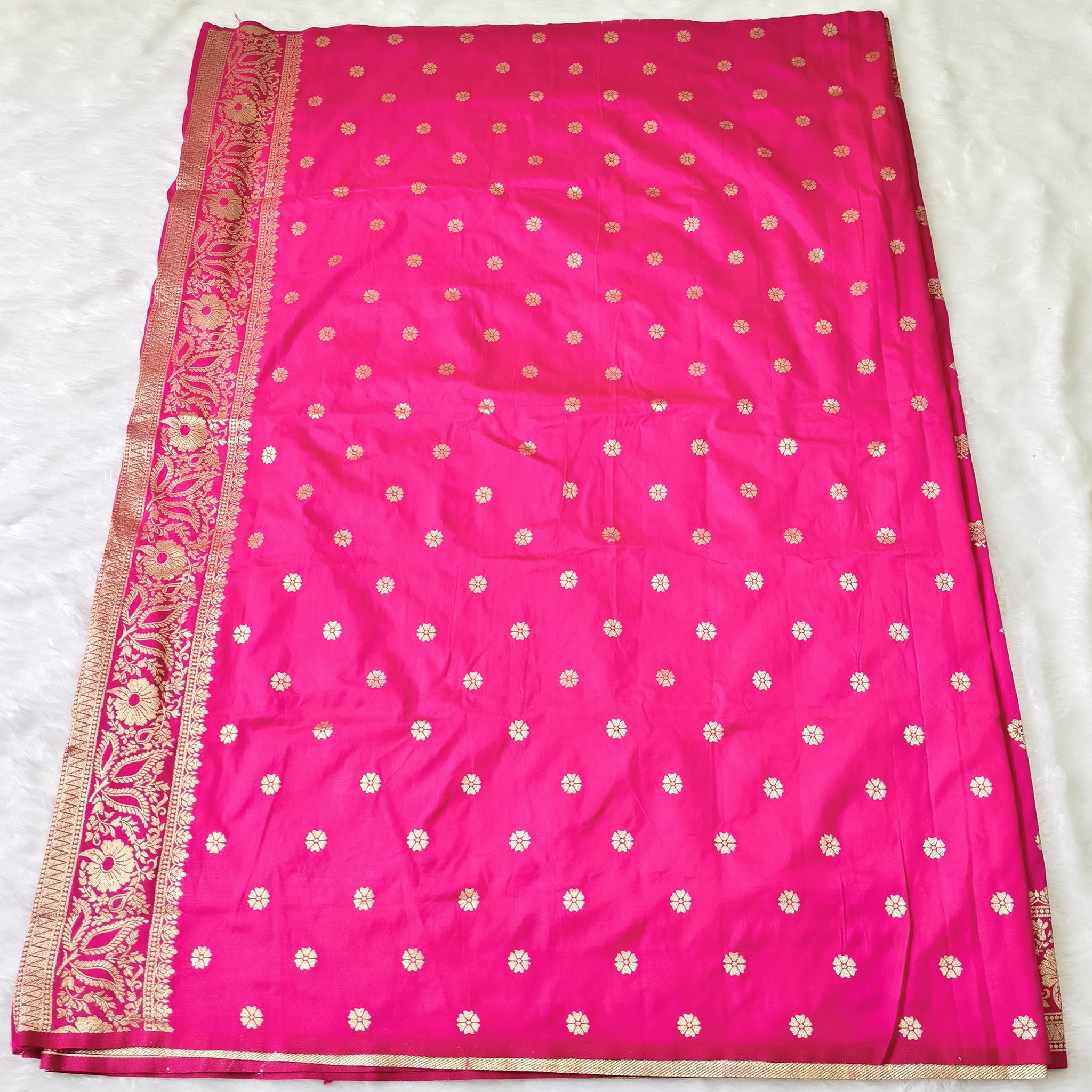 Golden zari border, small buttas on whole saree along with large floral design inside square shape.