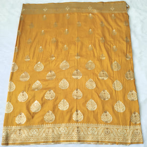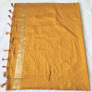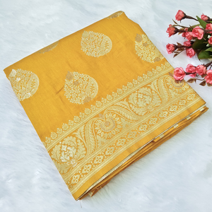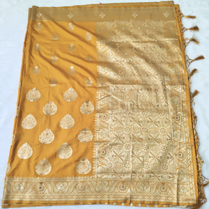 Golden zari border on whole saree, golden zari rich pallu, floral pattern golden zari work on whole saree.