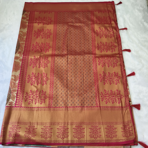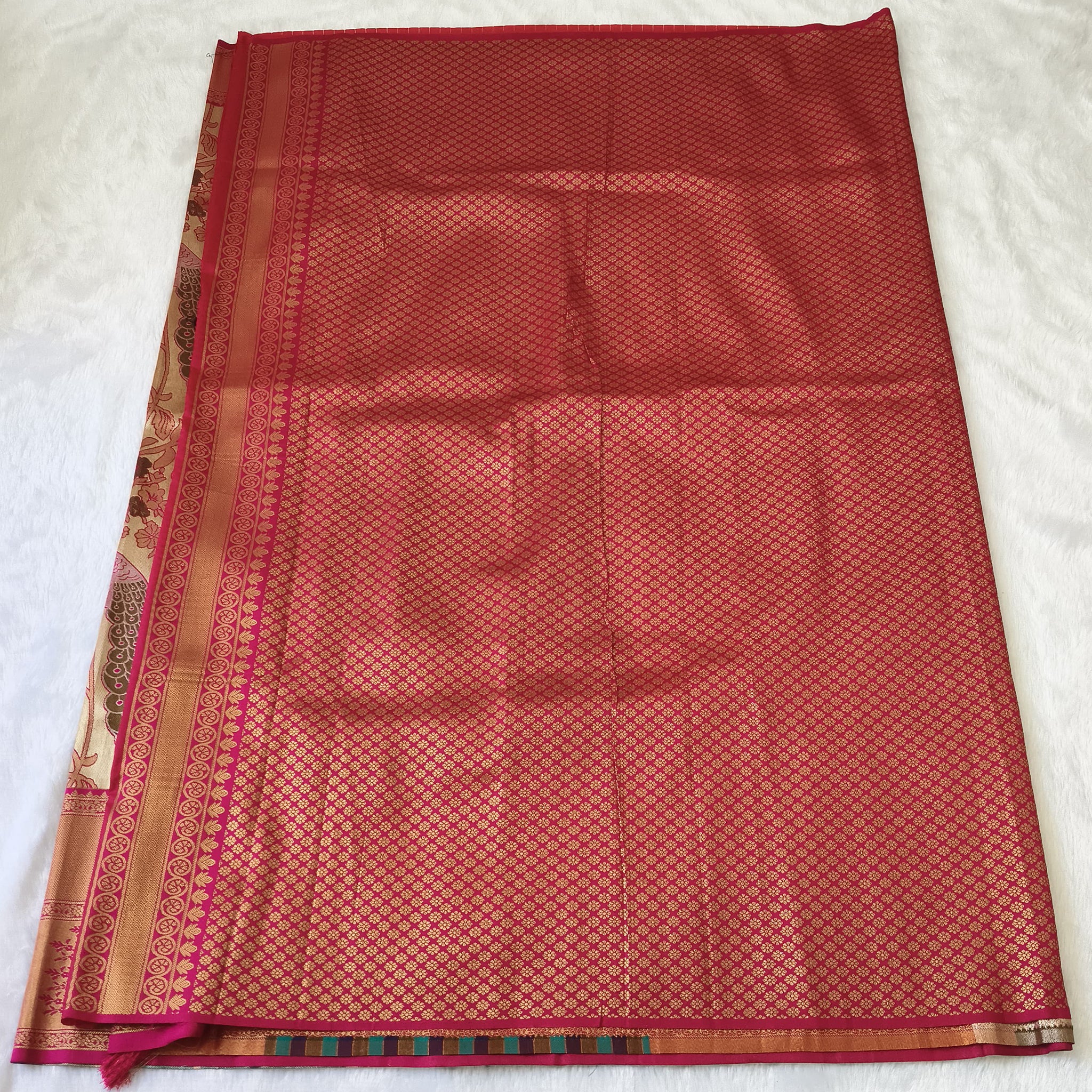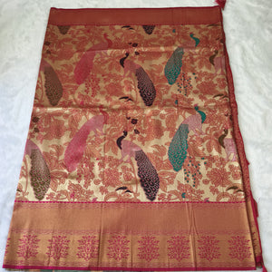 Big size border with golden zari, peacock and floral design on whole saree with rich pallu.