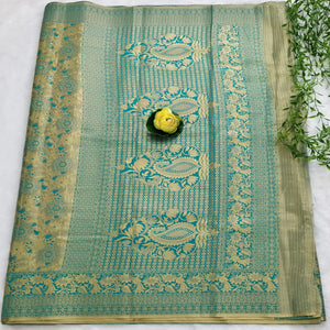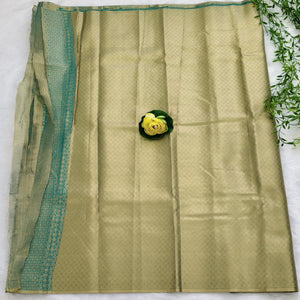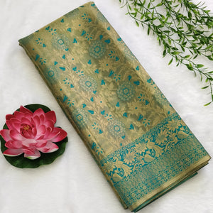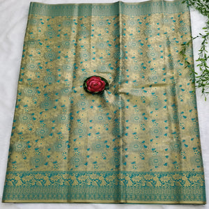 Golden zari big border, peacock and floral design on whole saree with golden zari work.