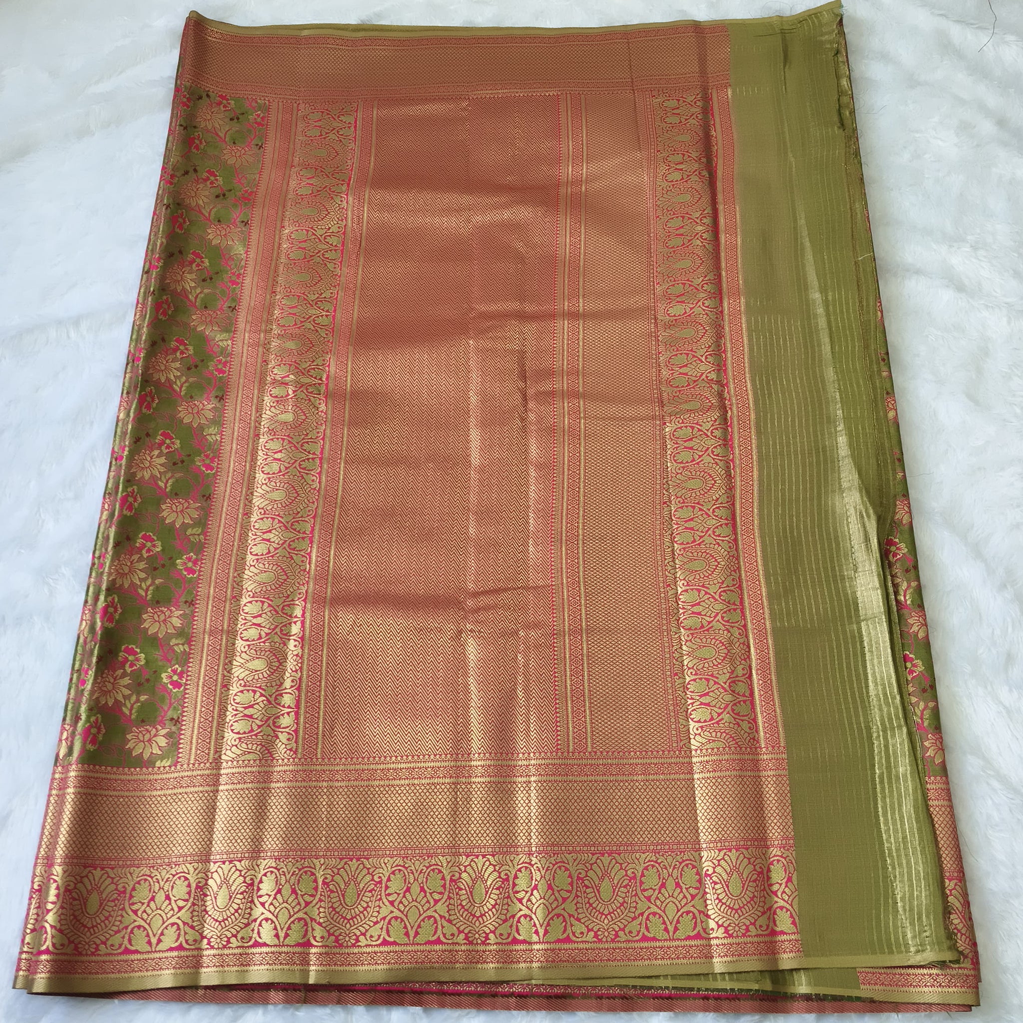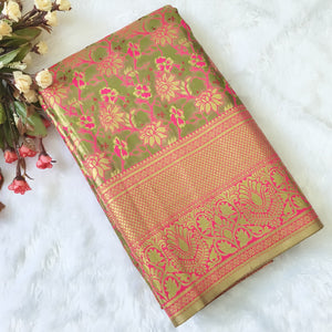 Big border, golden zari on whole saree, rich pallu, floral design weaving on whole saree.