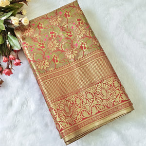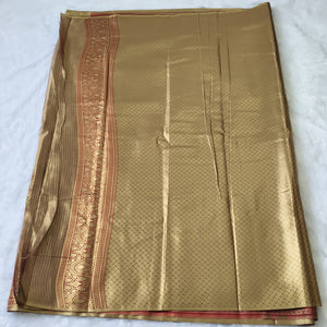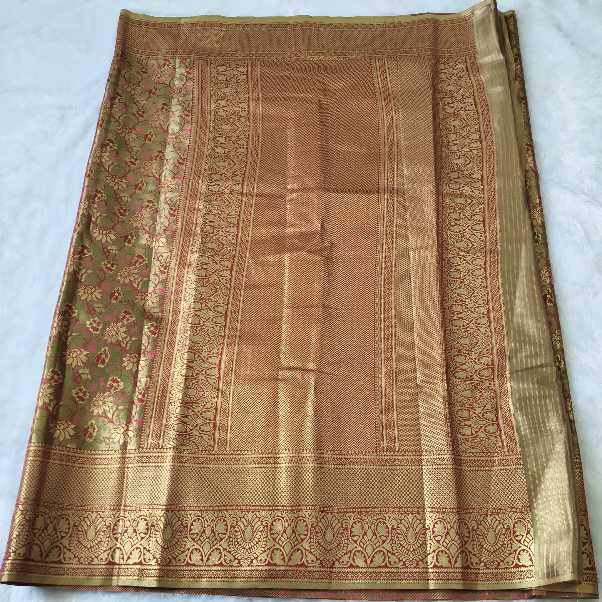 Big border, golden zari on whole saree, rich pallu, floral design weaving on whole saree.