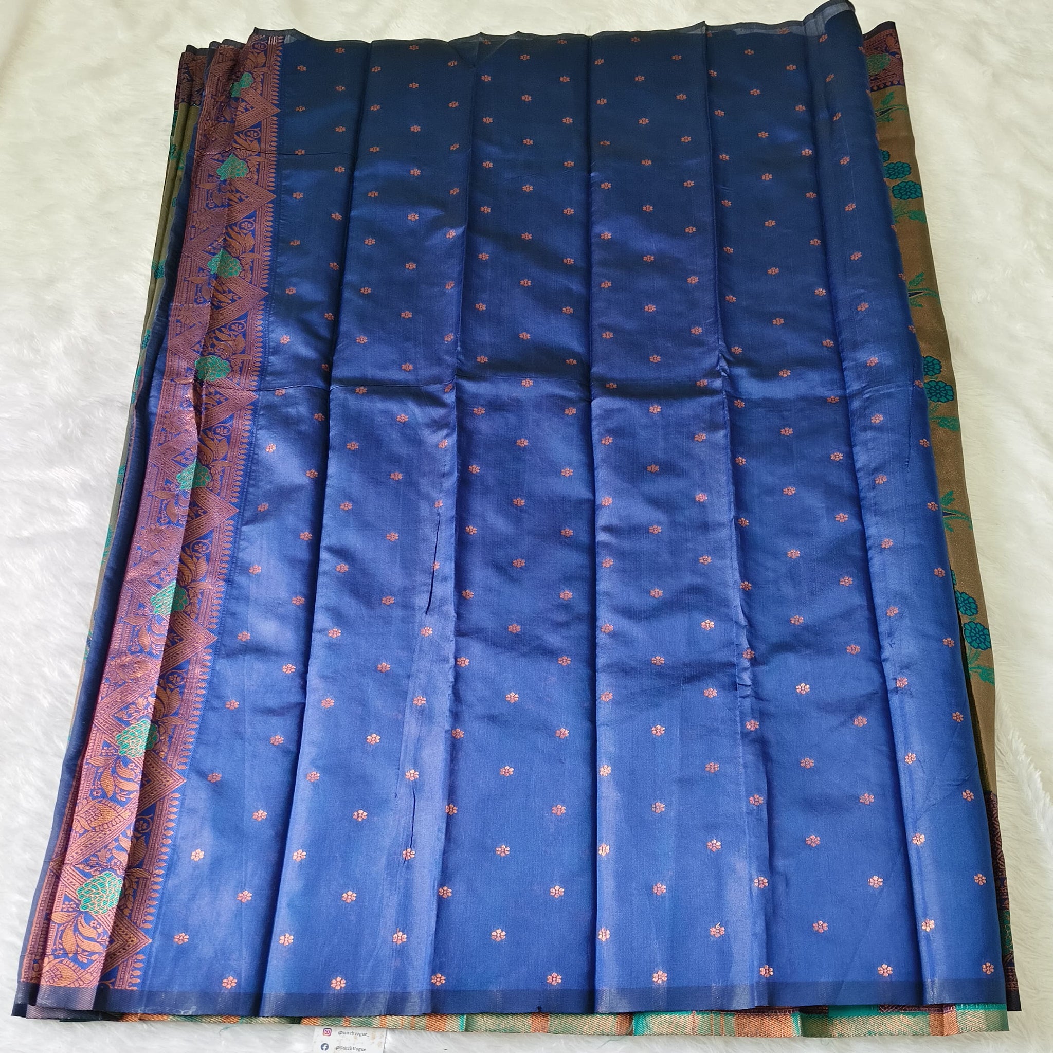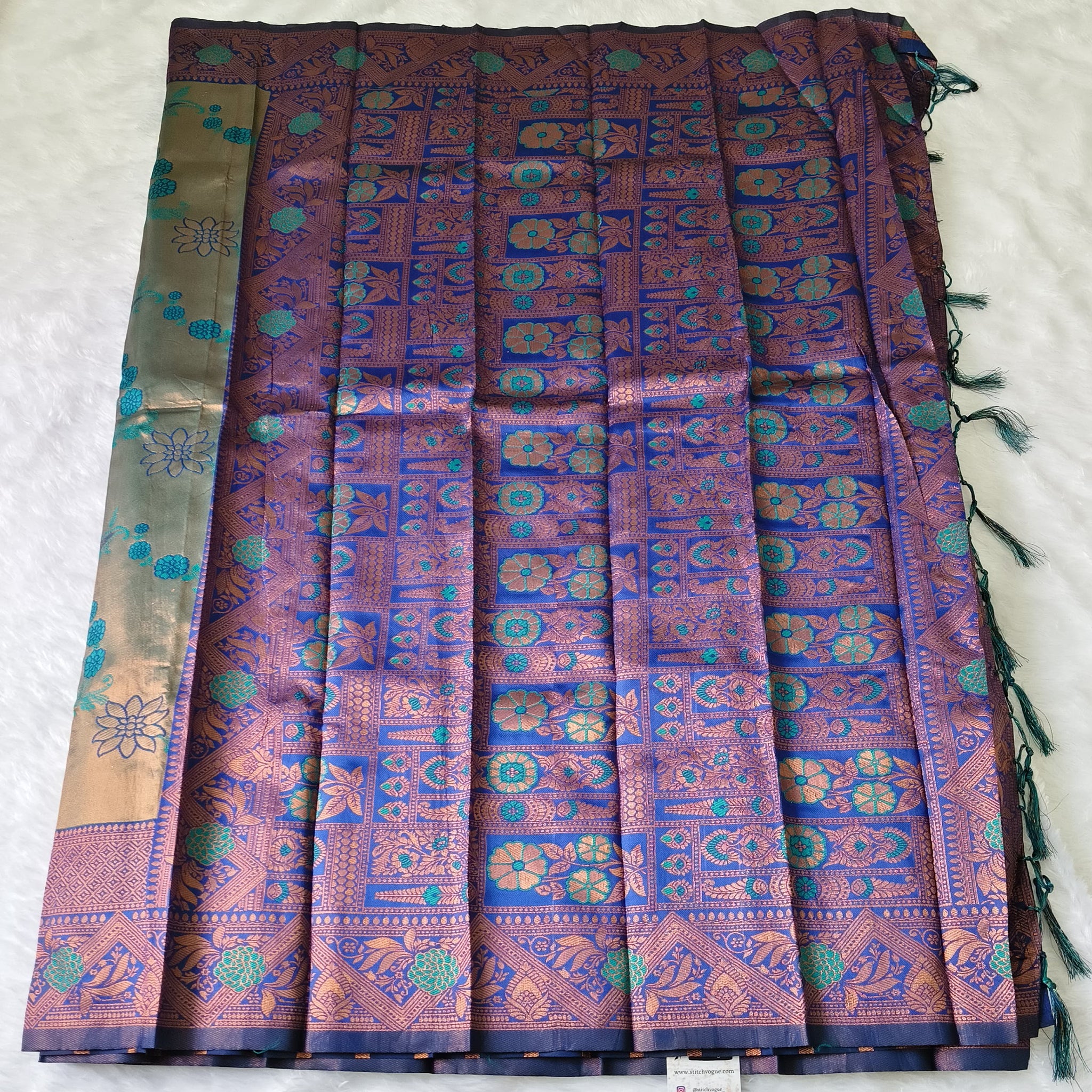 Copper Zari Border, floral design on whole saree and rich pallu.