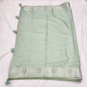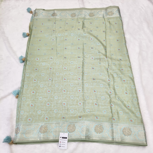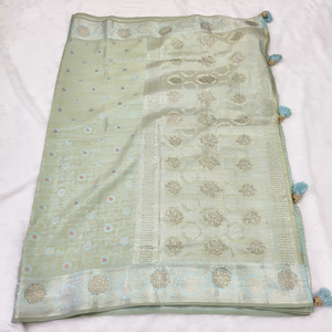 Silver color zari work on whole saree, Rich Pallu, Light Blue color floral design on whole saree, big size tassel on pallu, siroski work on border.