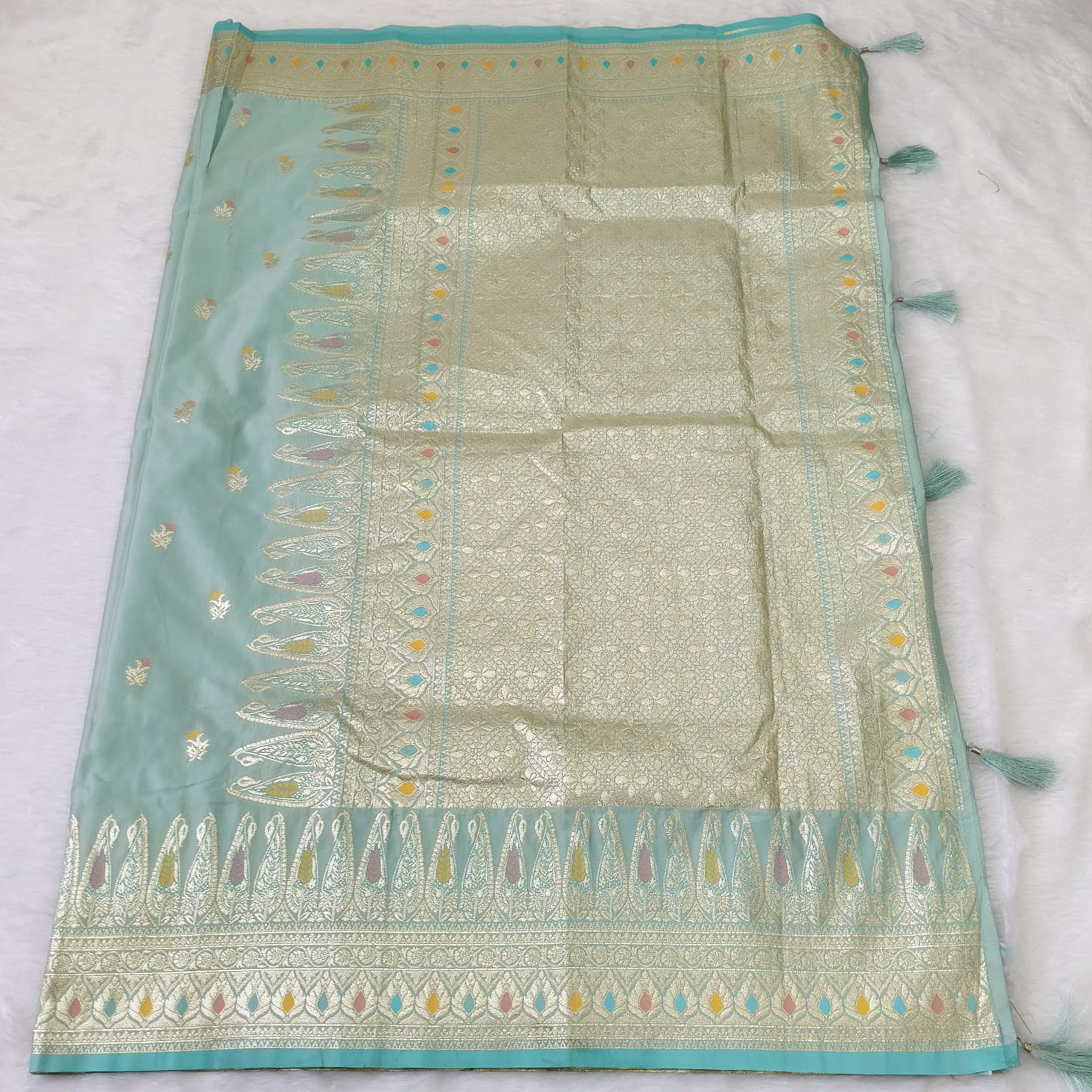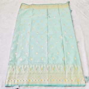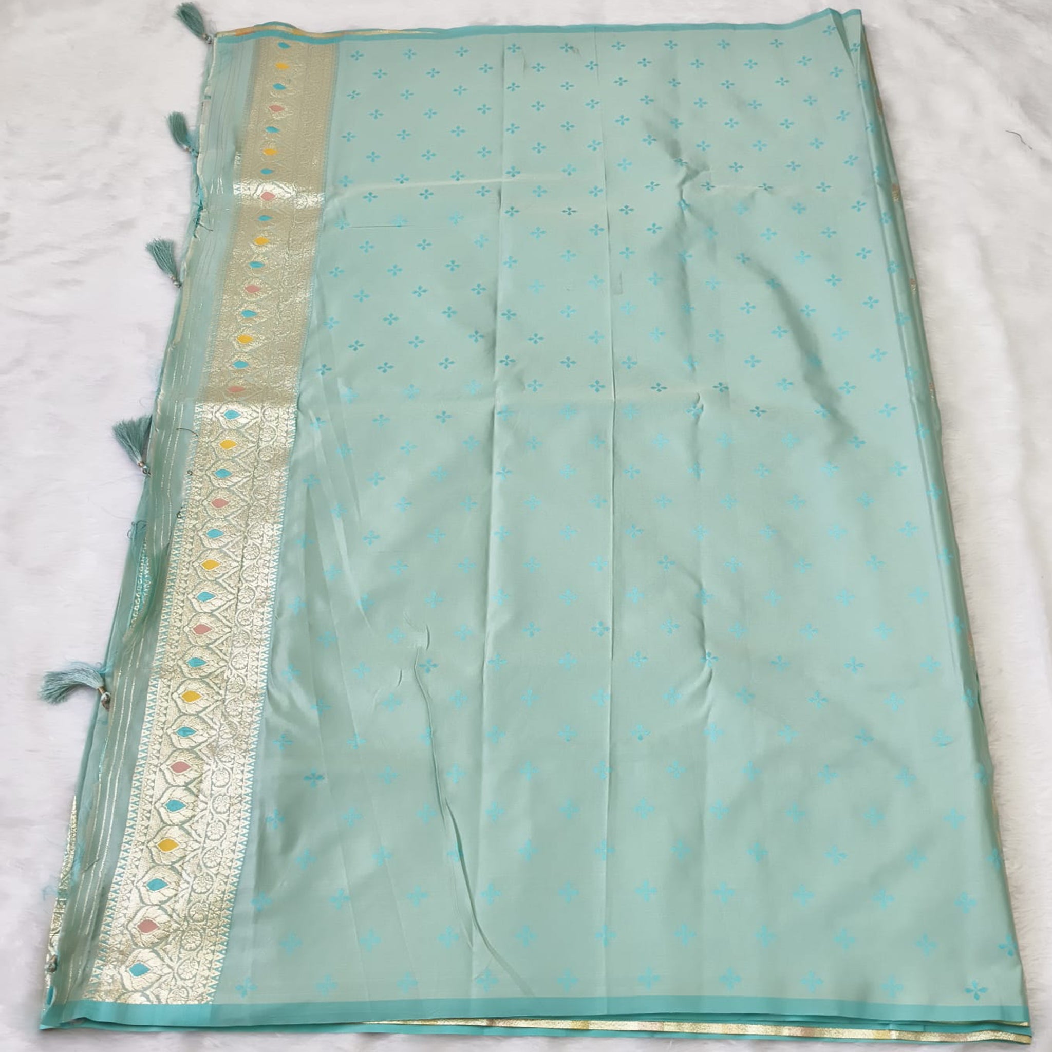 Golden zari big border, rich pallu, small buttas on whole saree.