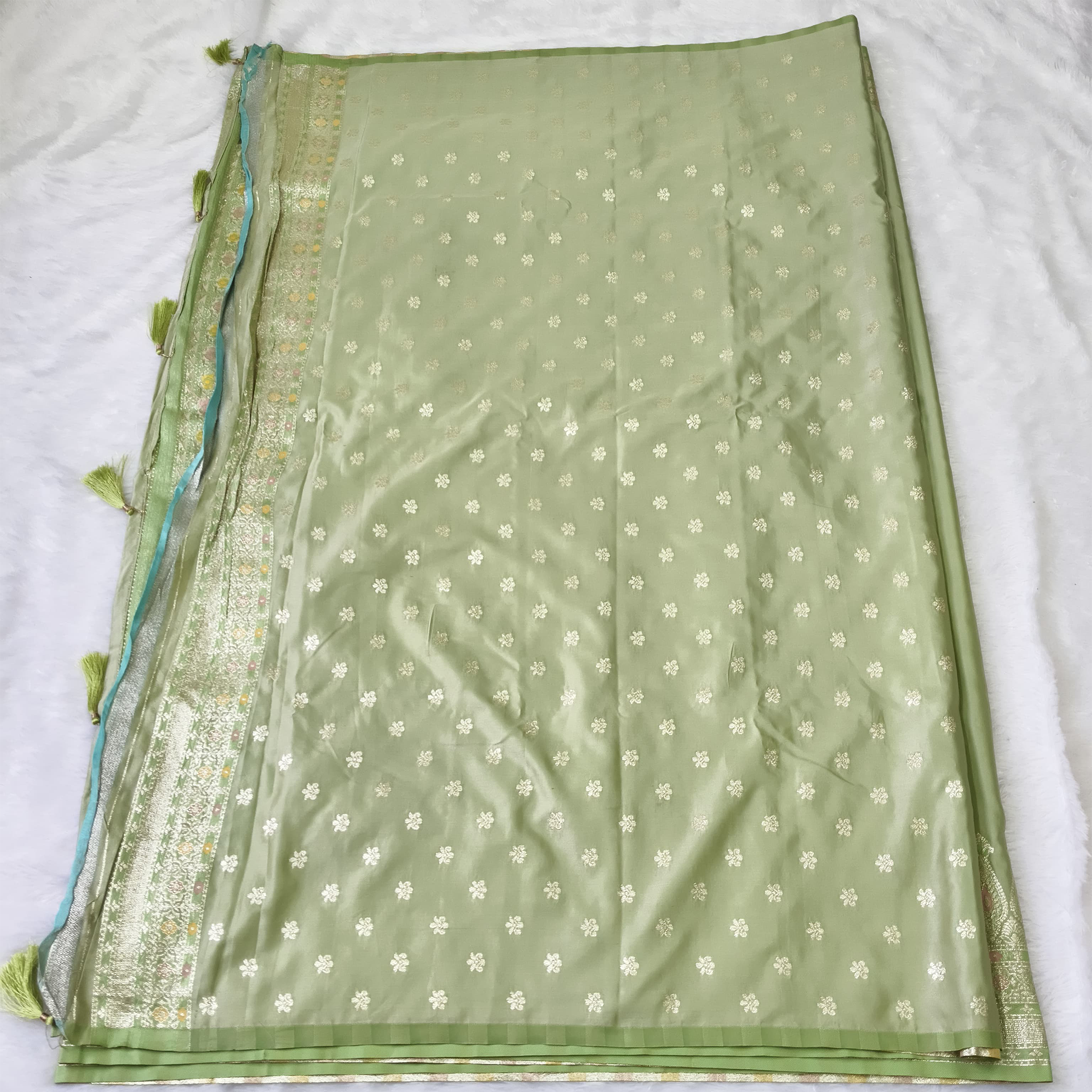 Golden zari big border, rich pallu, small buttas on whole saree.
