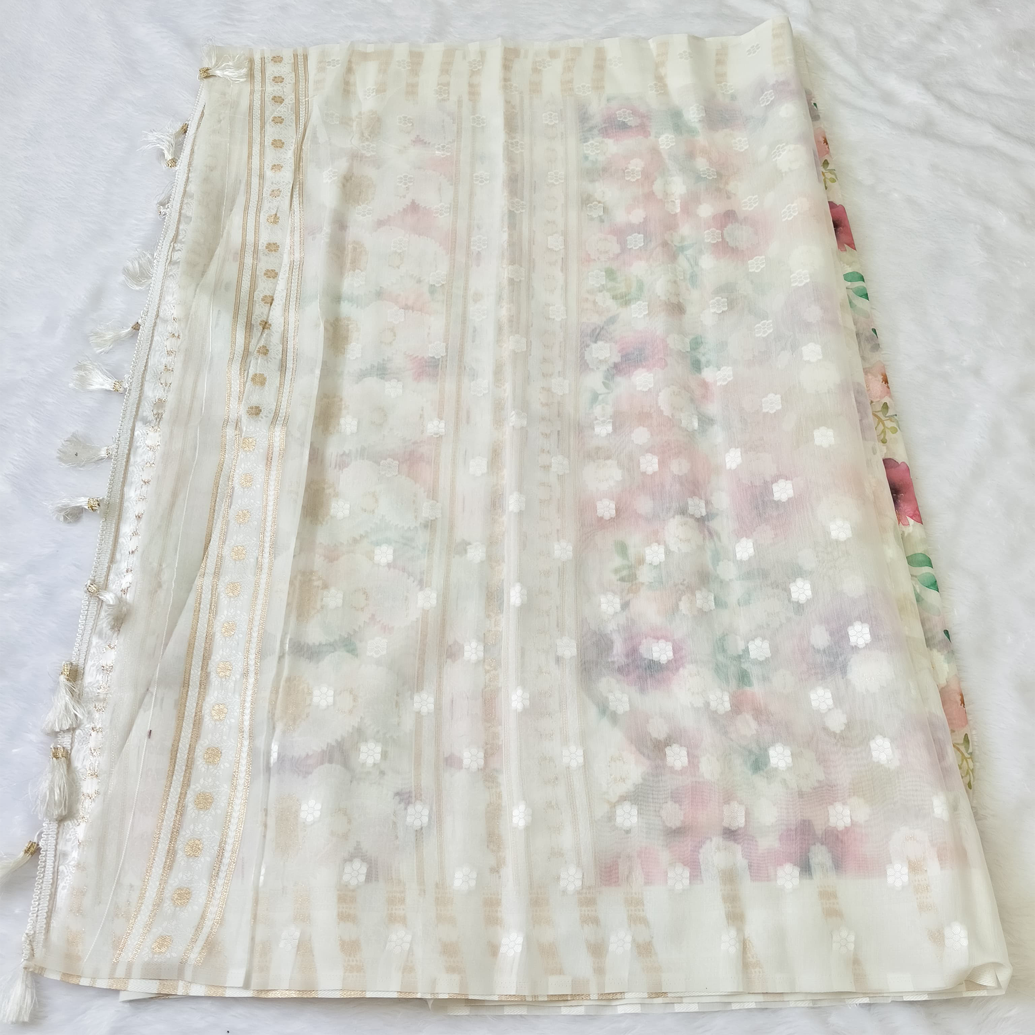 - Colour: White (Butta weaving on whole saree)