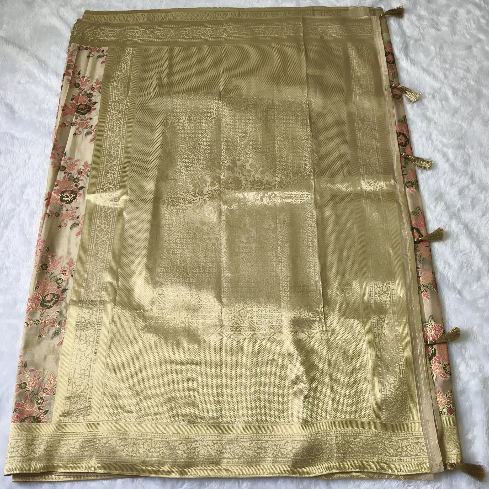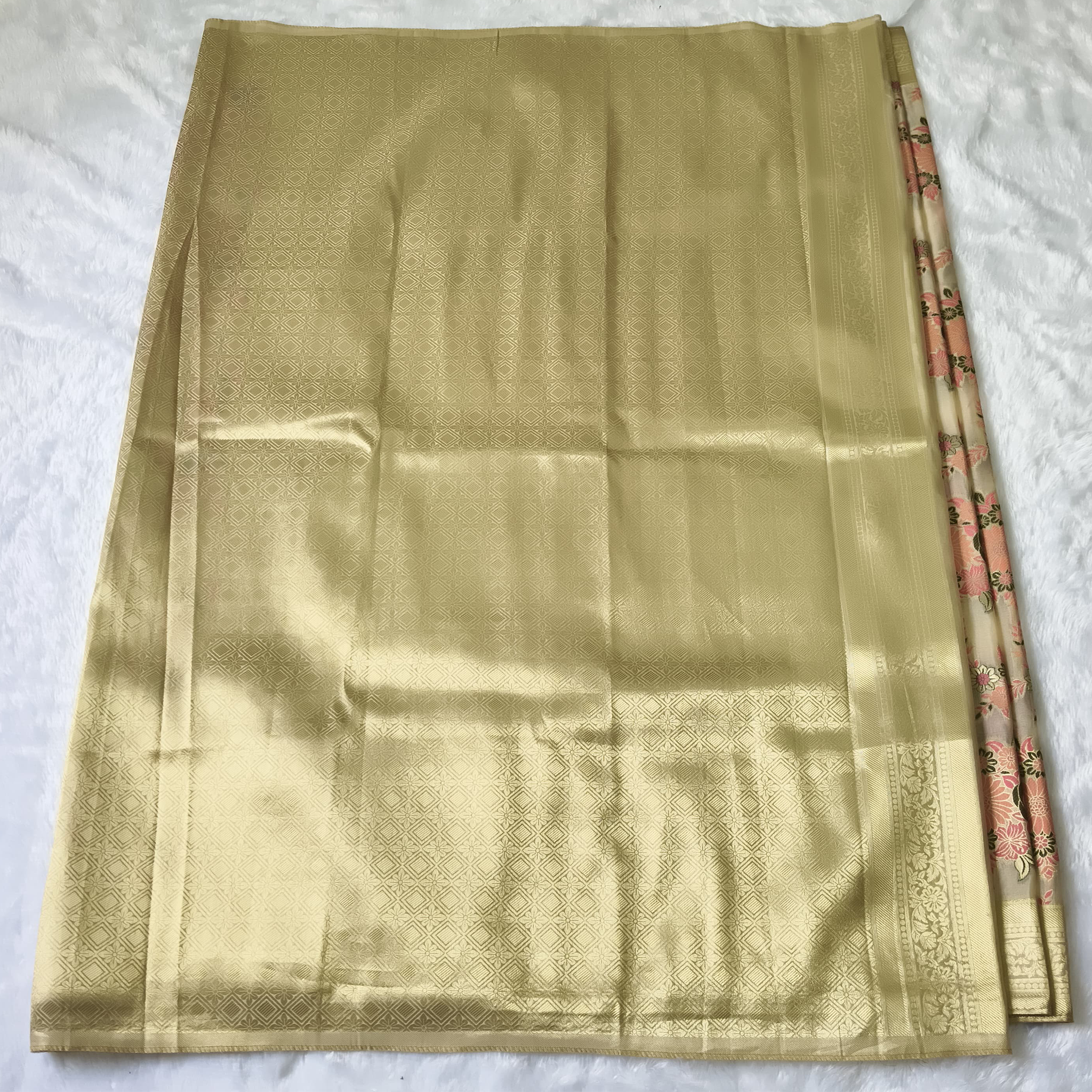 Golden zari work on border, floral design on whole saree, rich pallu.