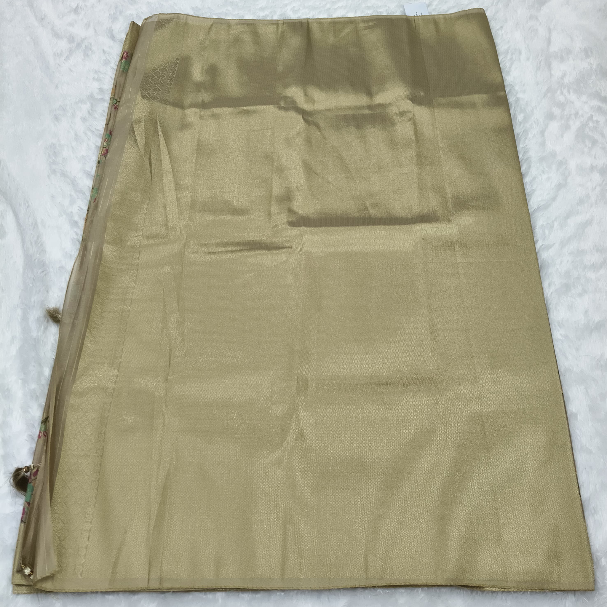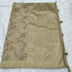 Golden zari work on border, floral design on whole saree, rich pallu.