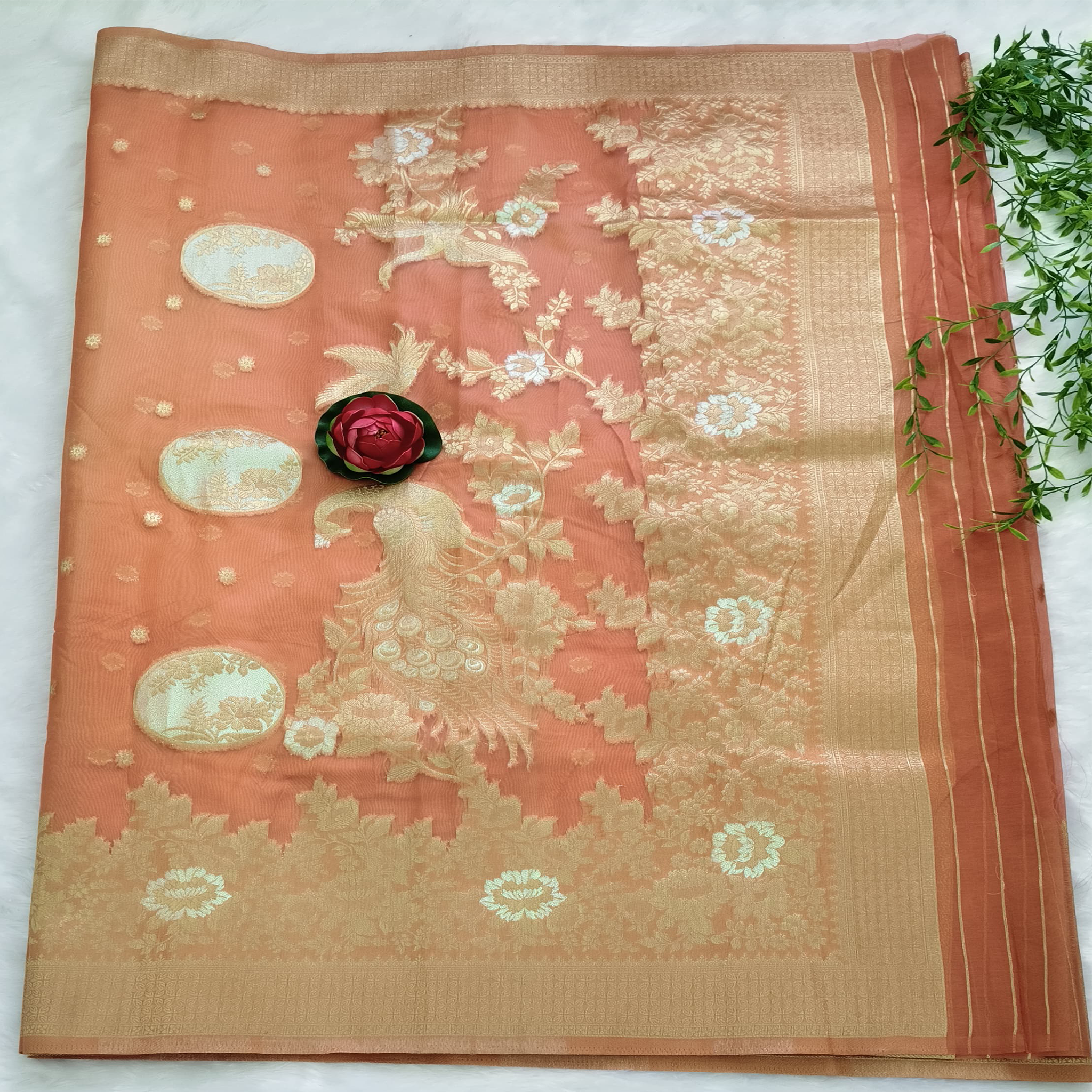 Our Organza Silk Saree is made of quality organza silk, providing a luxurious and lightweight feel. Perfect for any occasion, this saree adds a touch of elegance and sophistication to your wardrobe. With its delicate texture and beautiful drape, it's a must-have for any fashion-forward individual.