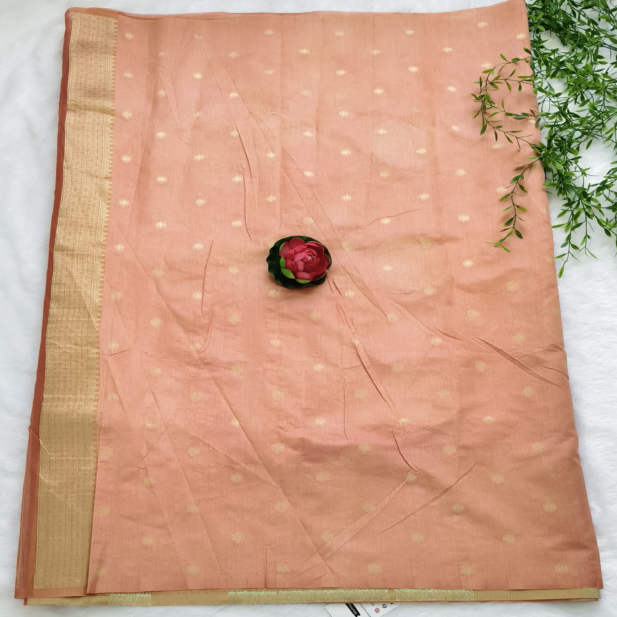 Golden zari work on border, small buttas on whole saree, rich pallu.