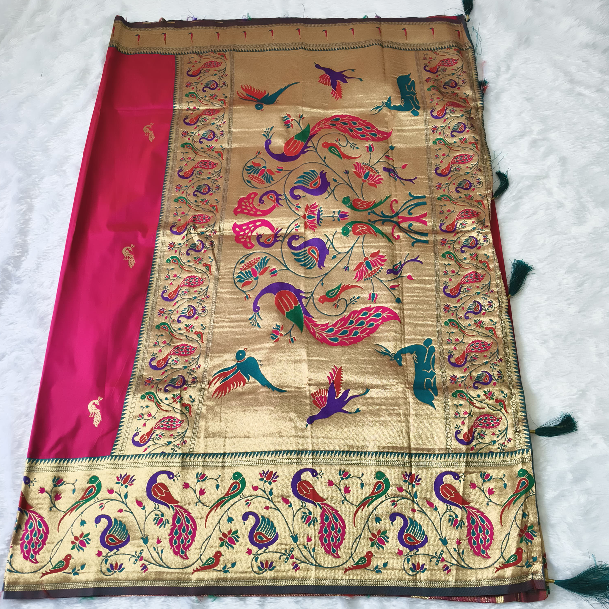 Golden zari big border with parrot & peacock design, small peacock on whole saree with golden zari.