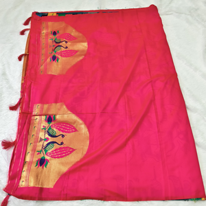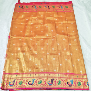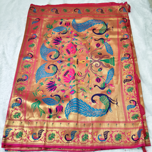 This exquisite Paithani Silk Saree showcases the tradition. Its intricate design and rich colors make it a true representation of Indian culture and beauty. Made with quality silk, it offers luxurious comfort and a timeless elegance. Elevate your wardrobe with this beautiful saree.