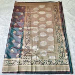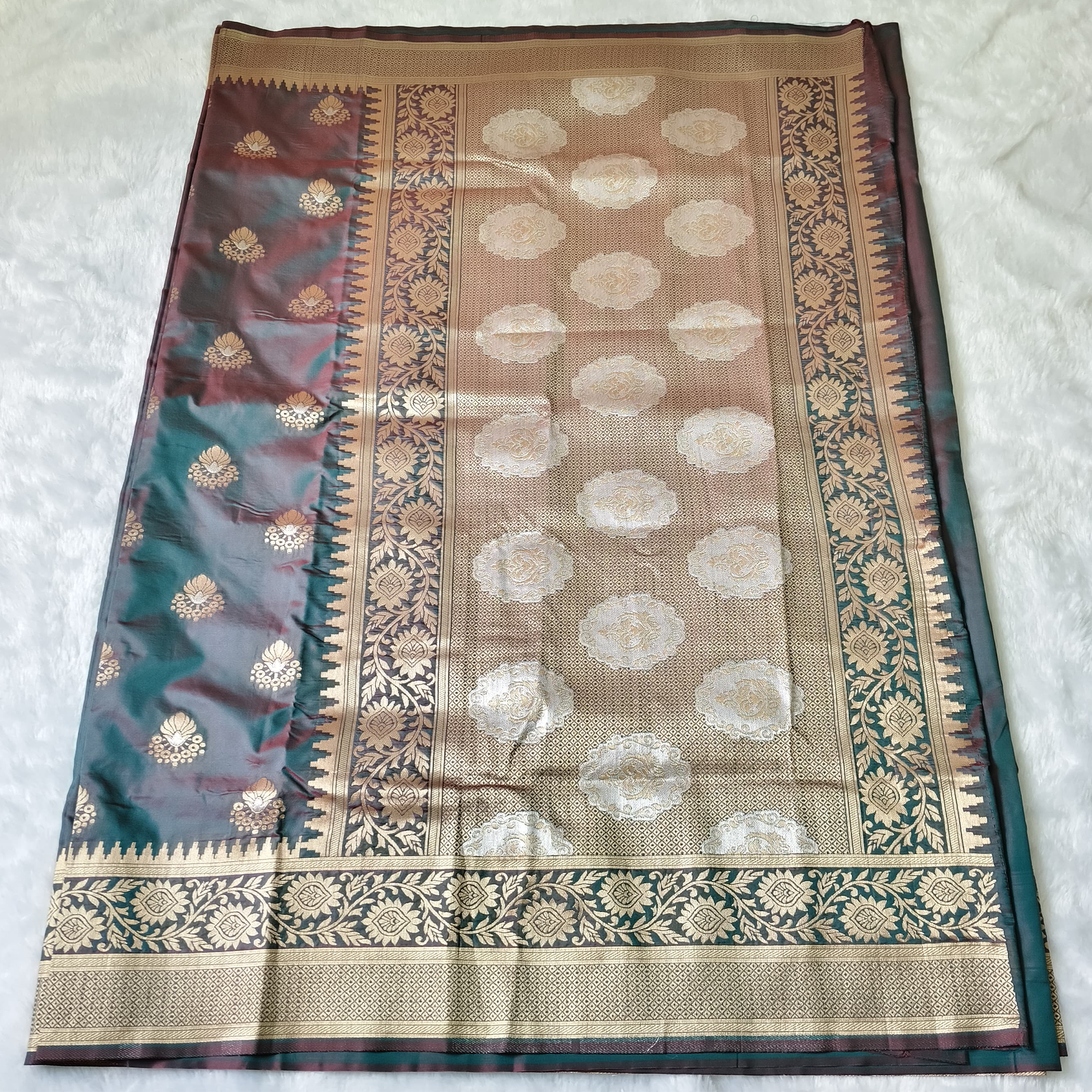 Golden zari big border on whole saree, big size golden butta design work on whole saree, rich pallu