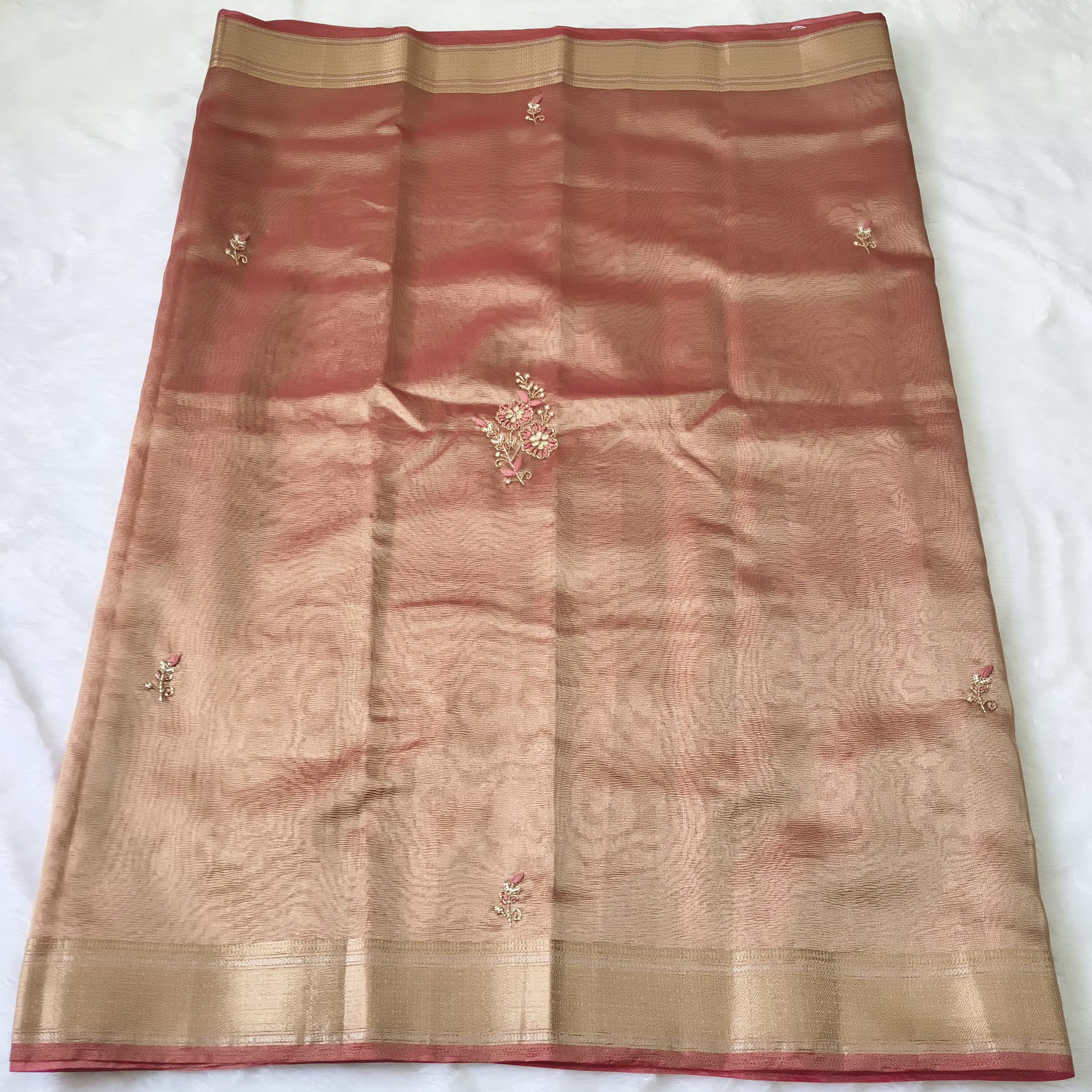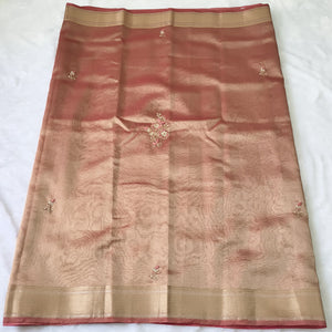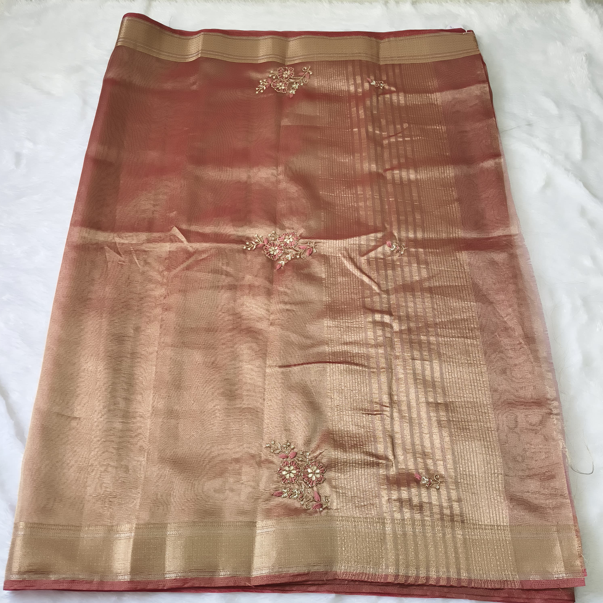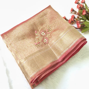 This tissue silk saree combines the luxurious feel of silk with the delicate drape of tissue fabric. This results in a lightweight and elegant saree, perfect for any occasion. Made with high-quality materials and traditional techniques, this saree is a must-have for any wardrobe.