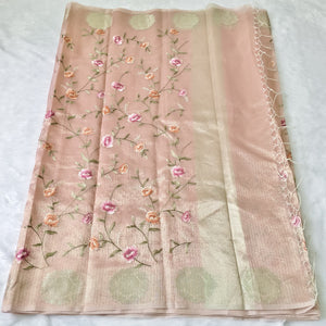 Crafted from the finest tissue silk, this saree is a must-have for any elegant occasion. Its delicate fabric offers a lightweight and airy feel, while its intricate details exude luxury and sophistication. Elevate your wardrobe with this timeless piece that seamlessly blends traditional charm with contemporary style.
